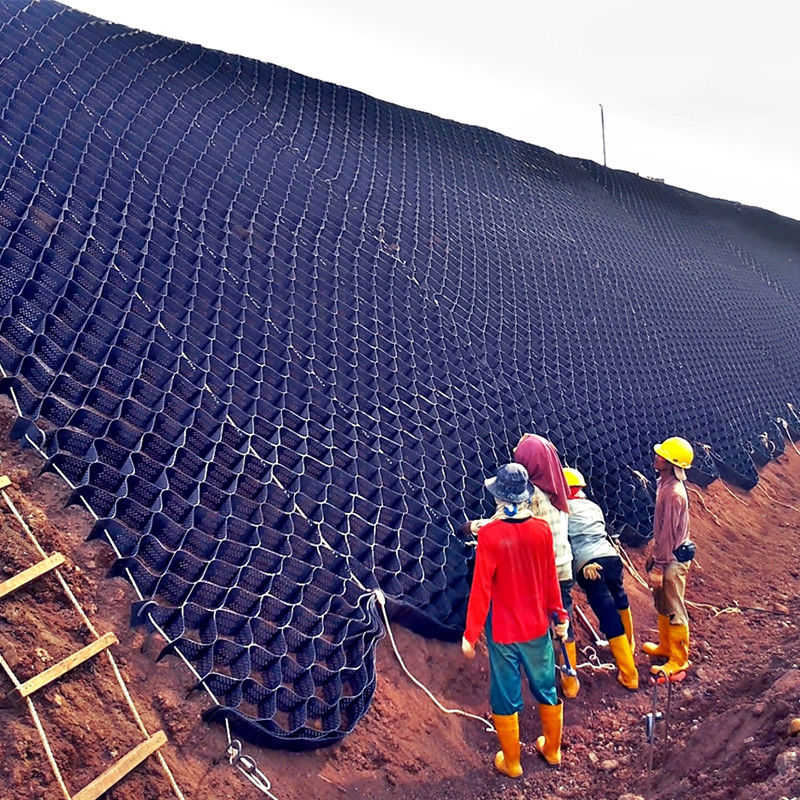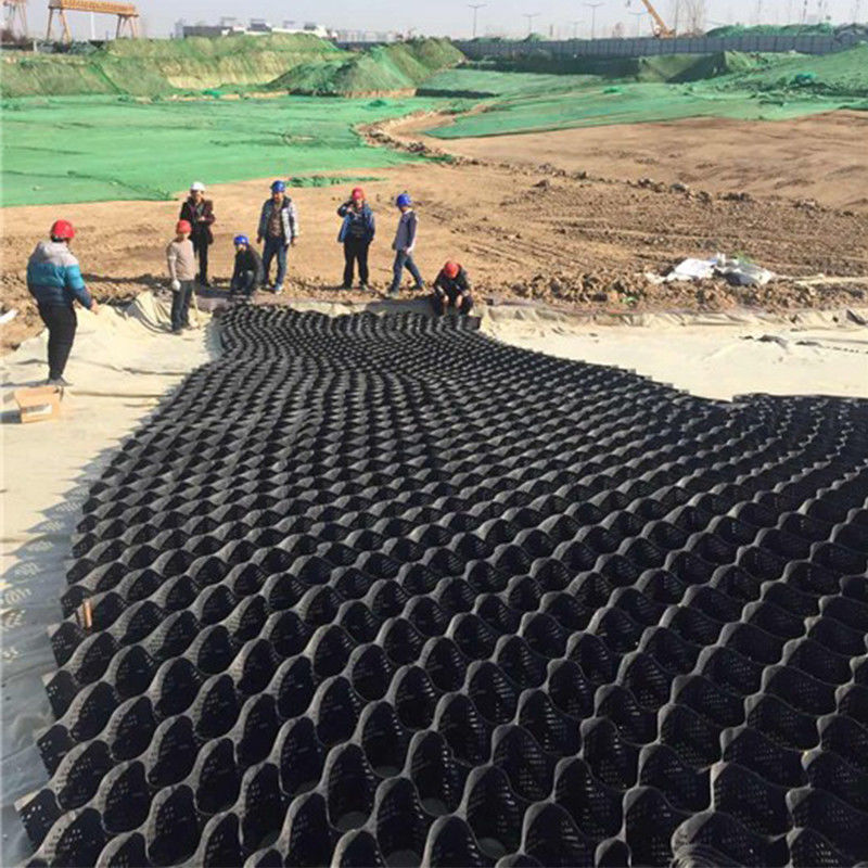O geocell do HDPE é tridimensional, favo de mel como as estruturas fabricadas do polietileno de alto densidade e soldadas comummente pela técnica ultrassônica. É flexível dobrar-se durante o transporte e a instalação no canteiro de obras. As redes do geocell serão enchidas com os solos, granulado, os cimentos ou outros materiais plenos no local quando esticadas em estruturas da Web, que tem o confinamento poderoso e rígido nos lados laterais e verticais.